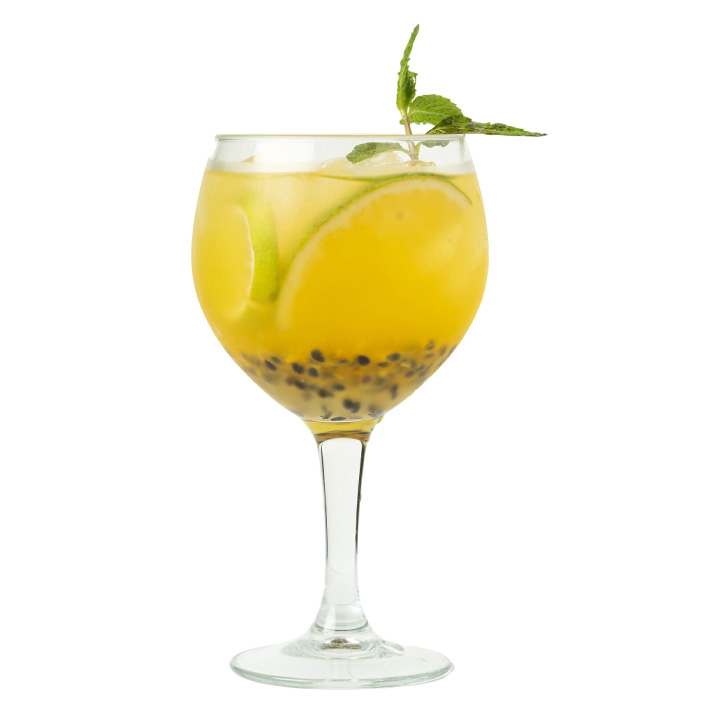 Ginebra, concentrado de maracuya, jugo de naranja y agua quina