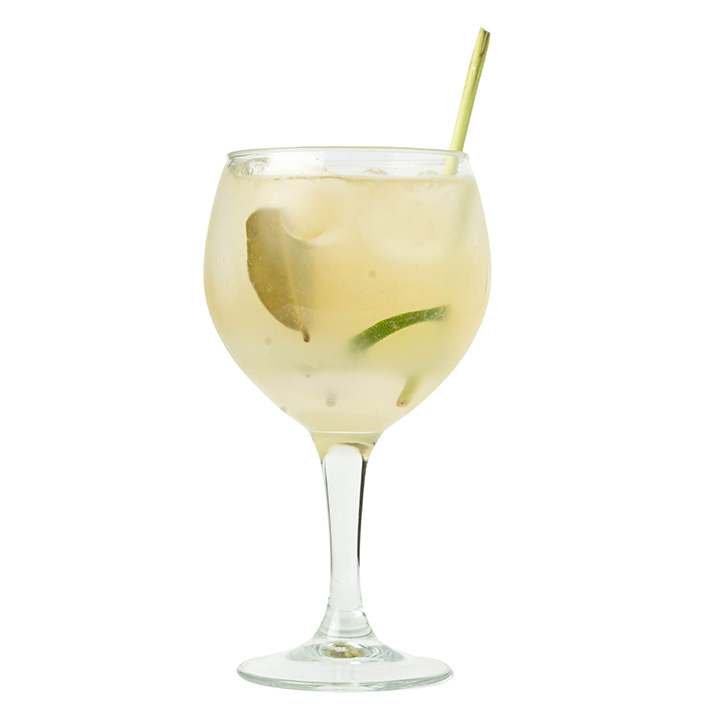 Ginebra, lima kaffir, jugo de limón y agua quina.