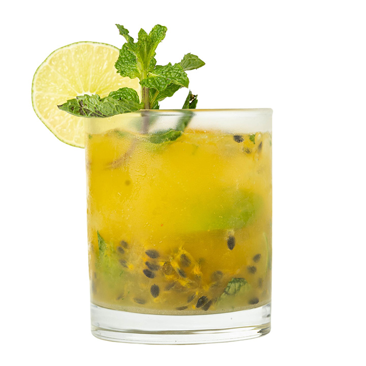 Maracuyá, hierbabuena, azúcar, ron, limón